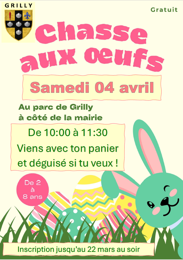 La mairie a le plaisir de vous inviter à une chasse aux œufs organisée pour les enfants âgés de 2 à 8 ans. Les enfants viennent avec leur panier et peuvent se déguiser s’ils le veulent.
