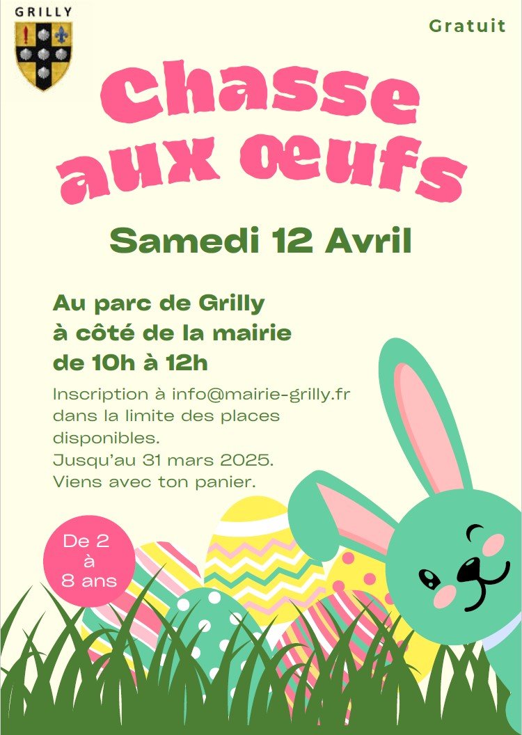 Chasse aux œufs le samedi 12 avril Evènements passés352 2 avril 2025 Chères Grillerandes, chers Grillerands, La mairie a le plaisir de vous inviter à une chasse aux œufs organisée pour les enfants âgés de 2 à 8 ans. Date : 12 avril 2025 Heure : 10h Lieu : Le parc de jeux de Grilly
