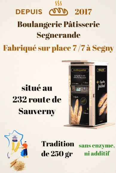 Tenu jusqu’à présent par la boulangerie HUMBERT de Saint-Jean-de-Gonville, ce distributeur de baguettes de pain a été repris début décembre par LA BOULANGERIE SEGNERANDE installée à Segny depuis 2017. Vous trouverez dans le distributeur « maBaguette » la même baguette de tradition de 250 gr, sans enzyme ni additif, fabriquée sur place à Segny.
