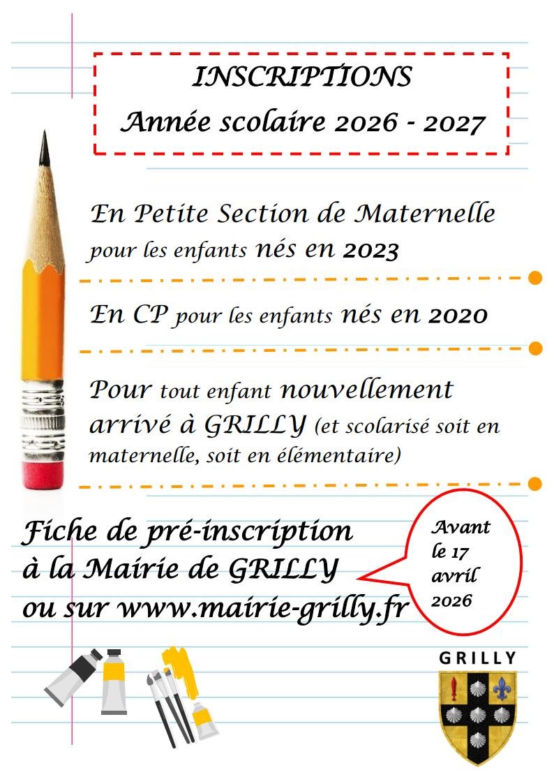 Pour cela, nous vous demandons de préinscrire vos enfants en mairie de GRILLY pour la rentrée scolaire prochaine – année 2026 / 2027 – si :